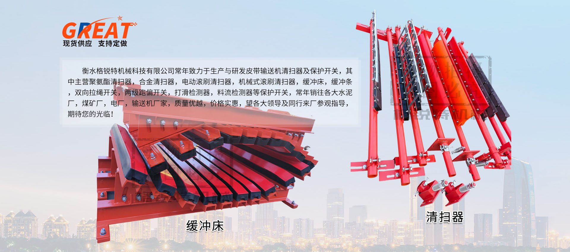 衡水格銳特機(jī)械科技有限公司常年致力于生產(chǎn)與研發(fā)皮帶輸送機(jī)清掃器及保護(hù)開(kāi)關(guān),其中主營(yíng)聚氨酯清掃器,合金清掃器,電動(dòng)滾刷清掃器,機(jī)械式滾刷清掃器,緩沖床,緩沖條,雙向拉繩開(kāi)關(guān),兩級(jí)跑偏開(kāi)關(guān),打滑檢測(cè)器,料流檢測(cè)器等保護(hù)開(kāi)關(guān),常年銷往各大水泥廠,煤礦廠,電廠,輸送機(jī)廠家,質(zhì)量?jī)?yōu)越,價(jià)格實(shí)惠,望各大領(lǐng)導(dǎo)及同行來(lái)廠參觀指導(dǎo),期待您的光臨!!!